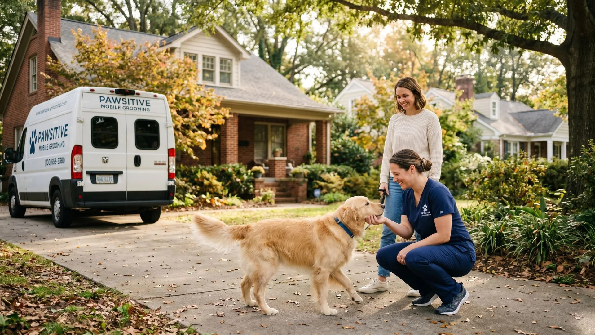 No drop-off, no waiting by the phone, no pickup run. We pull up, groom in the driveway, text you when finished.